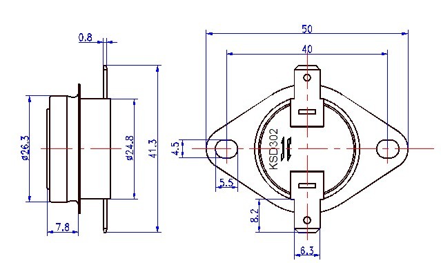 KSD302系列突跳式溫控器(碟片直徑7/8英寸)是帶外殼的雙金屬片溫控器;單刀單擲,工作于阻性負(fù)載下。其負(fù)載能力高,適合用于大功率的電器中作過熱保護(hù)之用。
